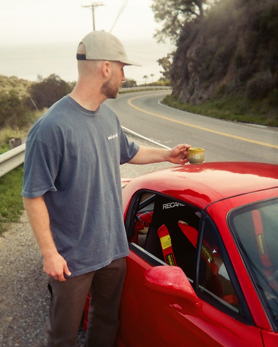 In a day rampant with all kinds of different Cars & Coffee's which seem to draw in a crowd most concerned about media coverage, it feels as though the coffee and genuine connection have almost entirely left the picture. Our latest Tee is a statement piece antithetical to that. For us it's the beverages we enjoy in and around the cars we most enjoy on the roads we most enjoy. There is nothing better than happenstance. When you cross paths with that one friend on that one road or that one cafe and the conversations ensue. There's a reason special cars always hit so much harder while out and about, and its because we're least expecting it. Our goal was to embody that with this Tee.